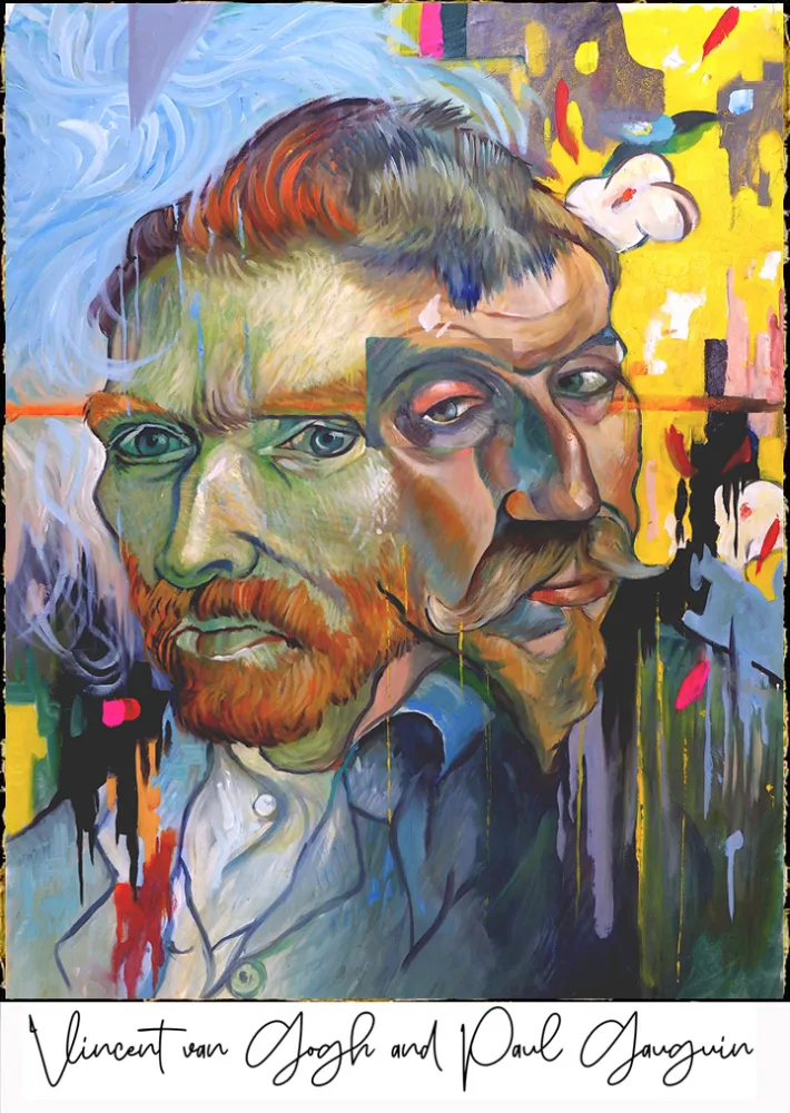 In this collection, The Power of Two, I’ve blended the likenesses of two well-known figures—often from different creative fields—into one unified portrait. Instead of showing them separately, I create a composite that symbolizes their shared influence and mutual inspiration. I think this approach captures the amazing dynamics that come into play when creative minds join forces. In a world that often highlights individual achievements, these paintings celebrate the incredible things that can happen when people work together.